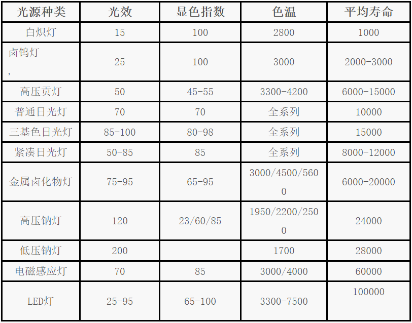 主要光源的技術(shù)指標(biāo)