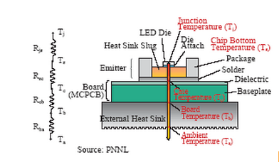 由于LED晶片的Sapphire 基板導熱特性較差,會造成圖三之熱阻值Rjs 過高,因此改善方式必須用高導熱的材料如銅取代Sapphire ,或是採用覆晶方式將基板移開熱傳路徑,以降低熱阻值。目前在晶片到封裝層級性能較佳的散熱設計,包括共融合金基板及覆晶形式等設計,使熱更容易從晶片傳到封裝中。而增加晶片尺寸以降低發熱密度也是可行的方向。