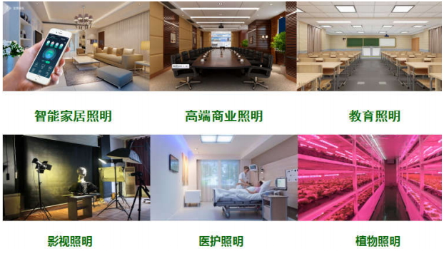 隨著 LED 技術的進步和提升,目前市場上全光譜光源應用領域越來越廣,主要應用于高端室內照明和影視照明以及植物照明等領域。其中高端室內照明、影視照明領域對于光照質量要求主要體現在顯色指數上,通常要求 Ra(R1-R8 的平均值)達到 95 以上,才能更好的呈現物體真實本色。舒適的光照品質,能夠緩解人體視覺疲勞,同時提高用戶對應用產品的滿意及信賴。全光譜 LED 應用場景圖例(如下圖 9):被廣泛應用于影視照明,智能家居照明、高端商業照明、教學照明、醫護照明、植物照明等對光照質量要求較高的場所。