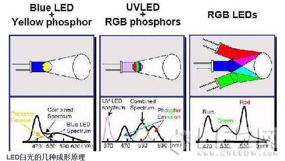 RGB燈的成像原理:RGB燈是以三原色共同交集成像,此外,也有藍光LED配合黃色熒光粉,以及紫外LED配合RGB熒光粉,整體來說,這兩種都有其成像原理,但是衰減問題與紫外線對人體影響,都是短期內比較難解決的問題,因此雖然都可以達 到白光的需求,卻有不同的結果。