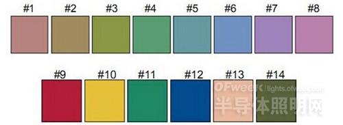 其中1-8號(hào)用于一般顯色指數(shù)Ra的評(píng)價(jià),選取的是8種具有中等飽和度的代表性色調(diào)。除規(guī)定了計(jì)算一般顯色指數(shù)用的8種標(biāo)準(zhǔn)顏色樣品外,CIE還補(bǔ)充規(guī)定了6種計(jì)算特殊顏色顯色指數(shù)的標(biāo)準(zhǔn)顏色樣品,供檢驗(yàn)光源的某種特殊顯色性能選用,分別是飽和度較高的紅、黃、綠、藍(lán)、歐美人的膚色和葉綠色(9-14號(hào))。